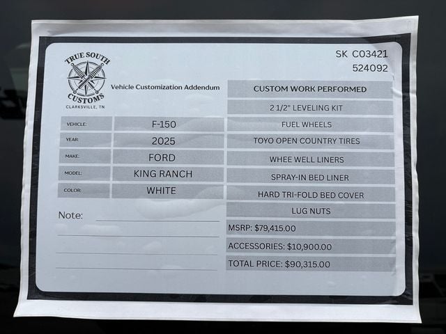Family Owned and Operated in Clarksville since 1953! Ask us about our '48 Hour Love It or Leave It- Price and Product Guarantee!' 14 Speakers, 4-Wheel Disc Brakes, ABS brakes, Adjustable pedals, Air Conditioning, Alloy wheels, AM/FM radio: SiriusXM with 360L, Auto High-beam Headlights, Auto tilt-away steering wheel, Auto-dimming door mirrors, Auto-dimming Rear-View mirror, Automatic temperature control, Brake assist, Chrome wheels, Compass, Delay-off headlights, Driver door bin, Driver vanity mirror, Dual front impact airbags, Dual front side impact airbags, Electronic Locking w/3.55 Axle Ratio, Electronic Stability Control, Emergency communication system: SYNC 4 911 Assist, Equipment Group 601A High, Front anti-roll bar, Front Bucket Seats, Front Center Armrest, Front dual zone A/C, Front fog lights, Front reading lights, Front wheel independent suspension, Fully automatic headlights, FX4 Off-Road Package, Garage door transmitter, Genuine wood dashboard insert, Heads-Up Display, Heated door mirrors, Heated front seats, Heated rear seats, Heated steering wheel, Illuminated entry, King Ranch Multicontour Leather Bucket Seats, Leather steering wheel, Low tire pressure warning, Memory seat, Navigation system: Connected Navigation, Occupant sensing airbag, Outside temperature display, Overhead airbag, Overhead console, Panic alarm, Passenger door bin, Passenger vanity mirror, Pedal memory, Power door mirrors, Power driver seat, Power moonroof, Power passenger seat, Power steering, Power windows, Radio data system, Radio: B&O Unleashed Sound System by Bang & Olufsen, Rain sensing wipers, Rear reading lights, Rear seat center armrest, Rear step bumper, Rear window defroster, Remote keyless entry, Security system, Speed control, Split folding rear seat, Steering wheel memory, Steering wheel mounted audio controls, SYNC 4 w/Enhanced Voice Recognition, Tachometer, Telescoping steering wheel, Tilt steering wheel, Traction control, Trip computer, Turn signal indicator mirrors, Variably intermittent wipers, Ventilated front seats, Voltmeter, Wheels: 20 Chrome-Like PVD. Price does not include tax, title and license. Manufacturer offers subject to change. Some offers are not compatible with special APR incentives. Price includes: $2000 - Retail Customer Cash