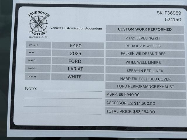 **Dealer Added Accessories: 2 1/2 Leveling Kit, Falken Tires, Petrol 20 Wheels, Wheel Well Liners, Ford Performance Exhaust, Tonneau Cover, and Spray in Liner** Upfit Price $12500**