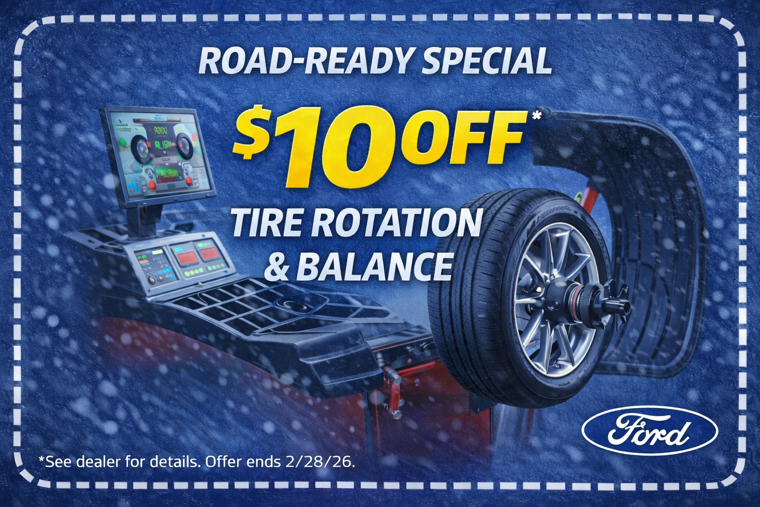 Keep your vehicle riding smoothly and your tires wearing evenly with professional care from Jenkins and Wynne Ford service. For a limited time, get $10 off a tire rotation and balance service. Regular rotations and proper balancing help extend tire life, improve ride comfort, and support better handling on the road. Promote even tire wear. Reduce vibration and steering shake. Help maximize tire life. Offer valid through 2/28/2026.