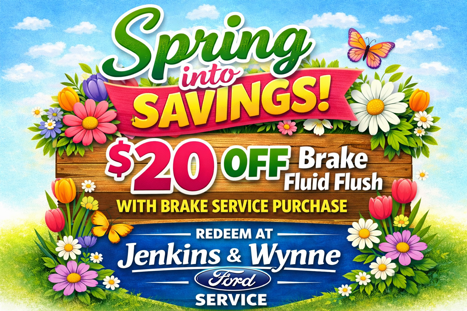 $20 off Brake Fluid Flush with purchase of brake service. Valid only at Jenkins and Wynne Ford Service. Must present coupon at time of service write-up. Cannot be combined with other offers or discounts. Not valid on prior purchases. Taxes and shop supplies may apply. Expires 3/31/2026.