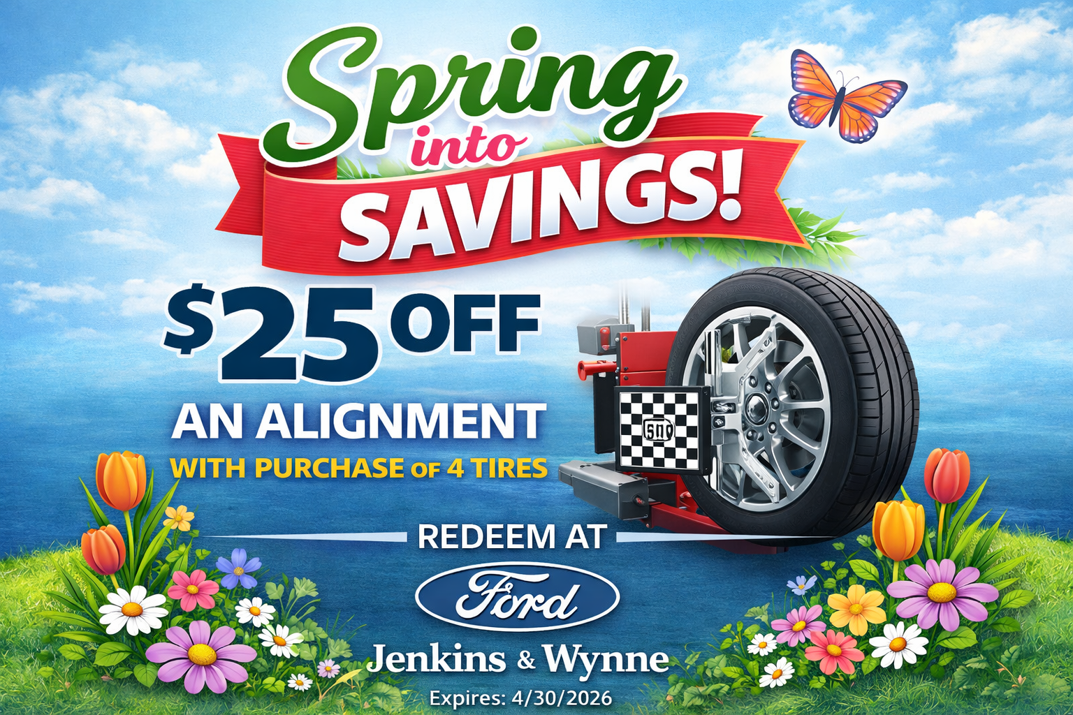 $25 off wheel alignment with purchase of four tires. Valid only at Jenkins and Wynne Ford Service. Must present coupon at time of service write-up. Cannot be combined with other offers or discounts. Can be combined with Ford's buy 3, get 1 tire for $1 offer. Not valid on prior purchases. Taxes, disposal fees, and shop supplies may apply. Expires 4/30/2026.