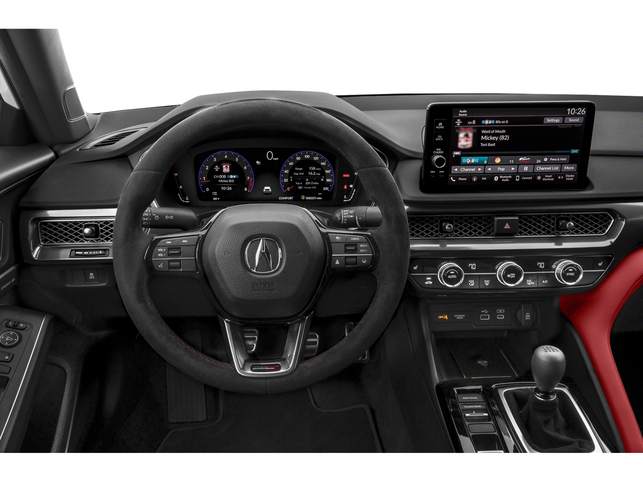 16 Speakers, 19 Aluminum-Alloy Wheels, 4-Wheel Disc Brakes, ABS brakes, Adaptive suspension, Air Conditioning, Alloy wheels, AM/FM radio: SiriusXM, Apple CarPlay/Android Auto, Auto High-beam Headlights, Auto-dimming Rear-View mirror, Automatic temperature control, Brake assist, Bumpers: body-color, Compass, Delay-off headlights, Driver door bin, Driver vanity mirror, Dual front impact airbags, Dual front side impact airbags, Electronic Stability Control, Emergency communication system: AcuraLink (subscription required), Four wheel independent suspension, Front anti-roll bar, Front Bucket Seats, Front Center Armrest, Front dual zone A/C, Front reading lights, Fully automatic headlights, Heads-Up Display, Heated door mirrors, Heated Front Bucket Seats, Heated front seats, Illuminated entry, Knee airbag, Lane departure: Lane Keeping Assist System (LKAS) active, Leather Shift Knob, Leather steering wheel, Low tire pressure warning, Occupant sensing airbag, Outside temperature display, Overhead airbag, Overhead console, Panic alarm, Passenger door bin, Passenger vanity mirror, Perforated Ultrasuede-Trimmed Front Seats, Power door mirrors, Power driver seat, Power steering, Power windows, Radio data system, Radio: ELS Studio 3D Premium Audio System, Rain sensing wipers, Rear anti-roll bar, Rear side impact airbag, Rear window defroster, Remote keyless entry, Security system, Speed control, Speed-sensing steering, Speed-Sensitive Wipers, Split folding rear seat, Spoiler, Steering wheel mounted audio controls, Tachometer, Telescoping steering wheel, Tilt steering wheel, Traction control, Trip computer, Turn signal indicator mirrors, Variably intermittent wipers.